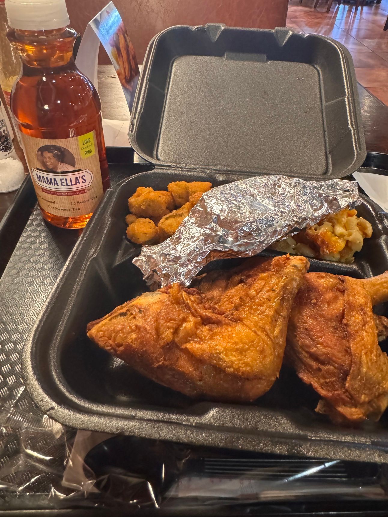Believe it or not there are three pieces of chicken pictured here and a roll, fried okra and macaroni and cheese, bottled sweet tea. The sweet tea is delicious sweet however I would like to see this location get an ice machine or soda fountain but I do understand that that does come with extra cost and maintenance. The staff did offer me a cup of ice which was very nice. The chicken was hot and crispy, okra juicy and also crispy and the macaroni and cheese was perfect. Overall, I highly recommend this place for anybody looking for a nice soul food plate. Definitely a nice option to bring variety to Friendly Center - Yum!