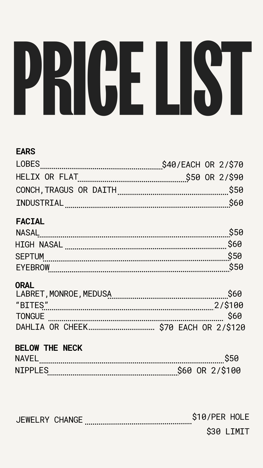 Dani’s Price List