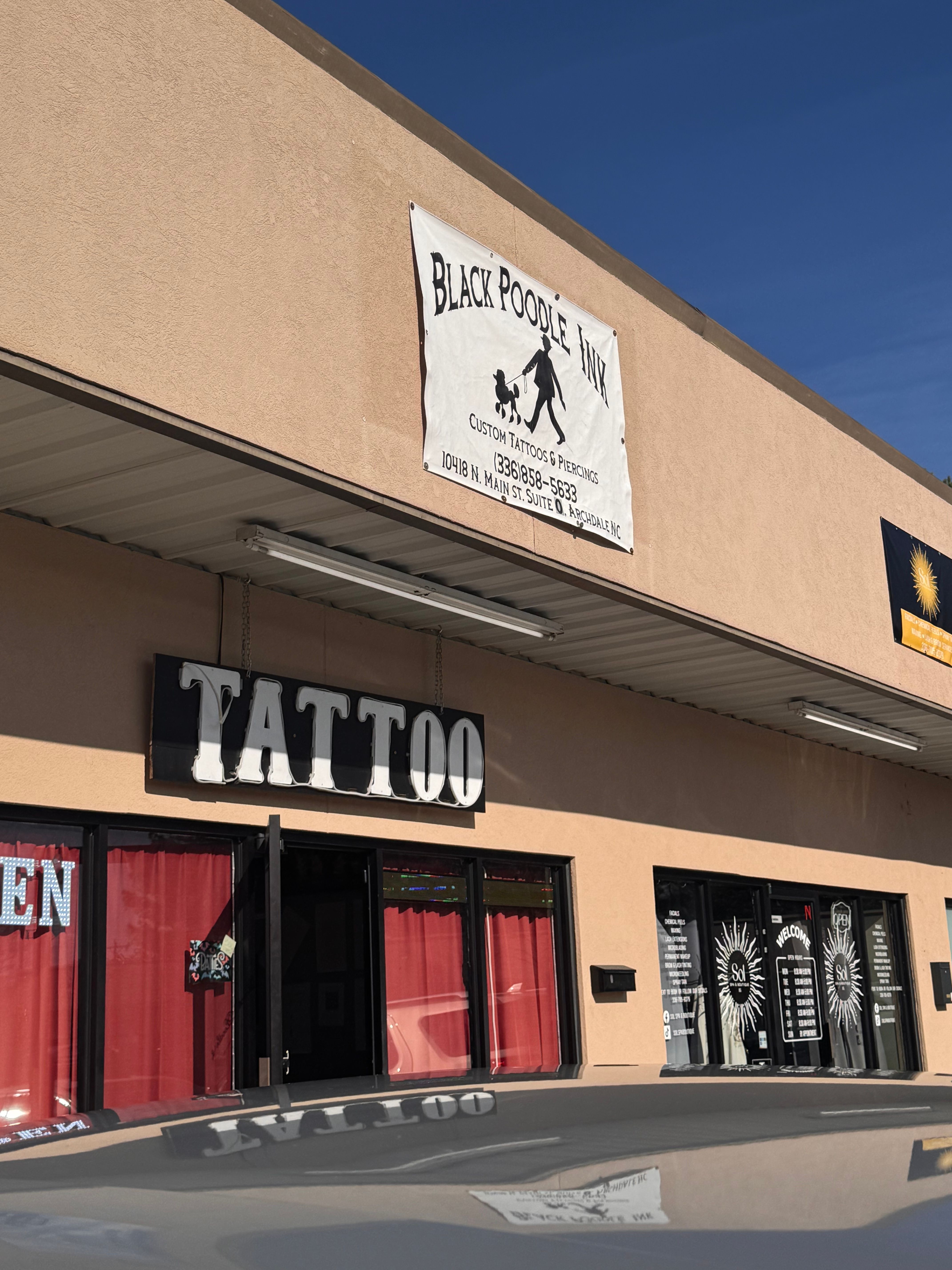 Black Poodle Ink is located at 10418 N Main St in Archdale. I had the luxury of being invited out to get a piercing by my friend Dani. I decided on a conch piercing.