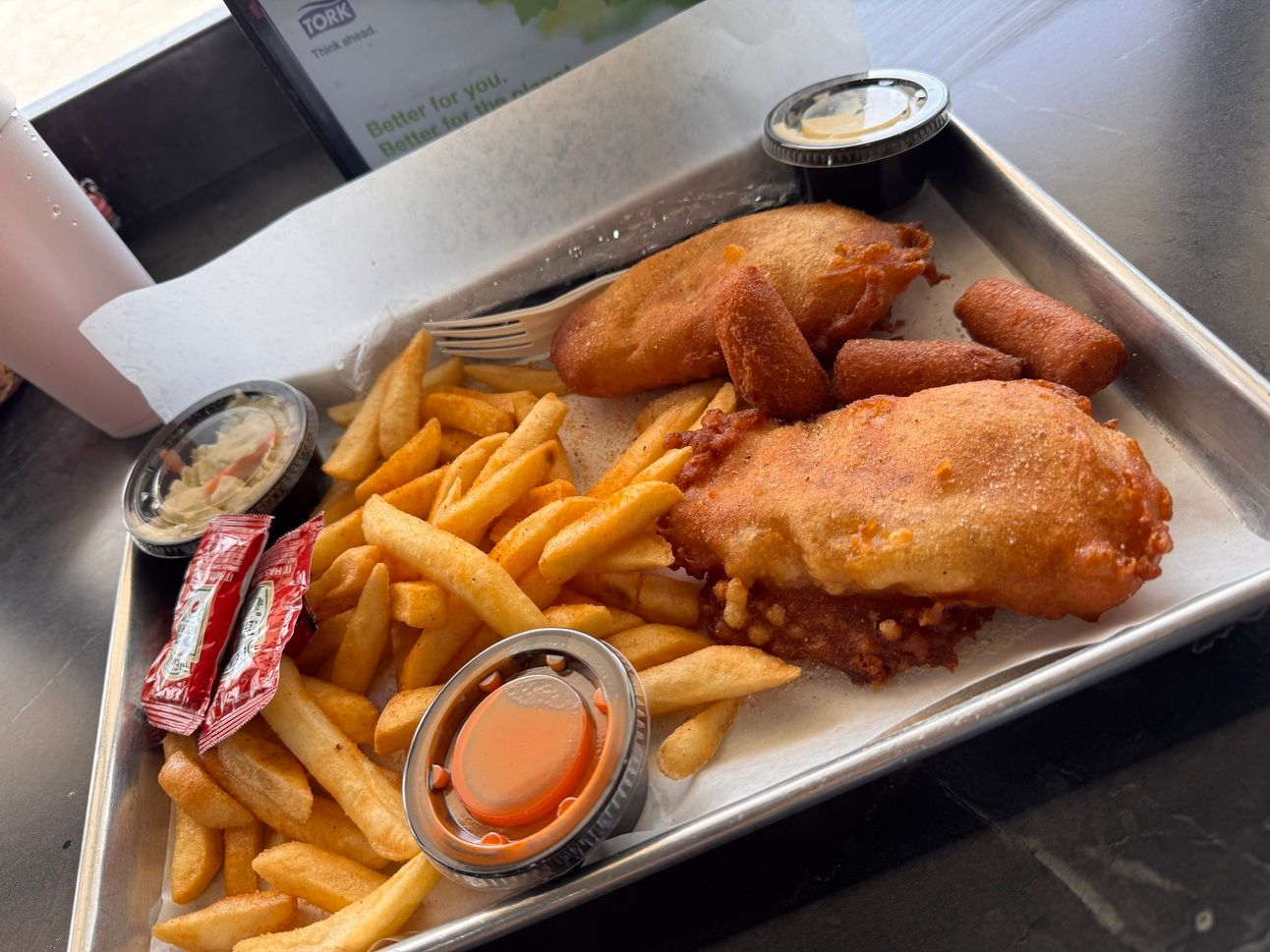 I got two large cod fillets with fries, coleslaw, hush puppies and a drink for $15. I enjoyed everything especially the crispy light batter on the fish fillets. I will definitely be back to try the shrimp next time.