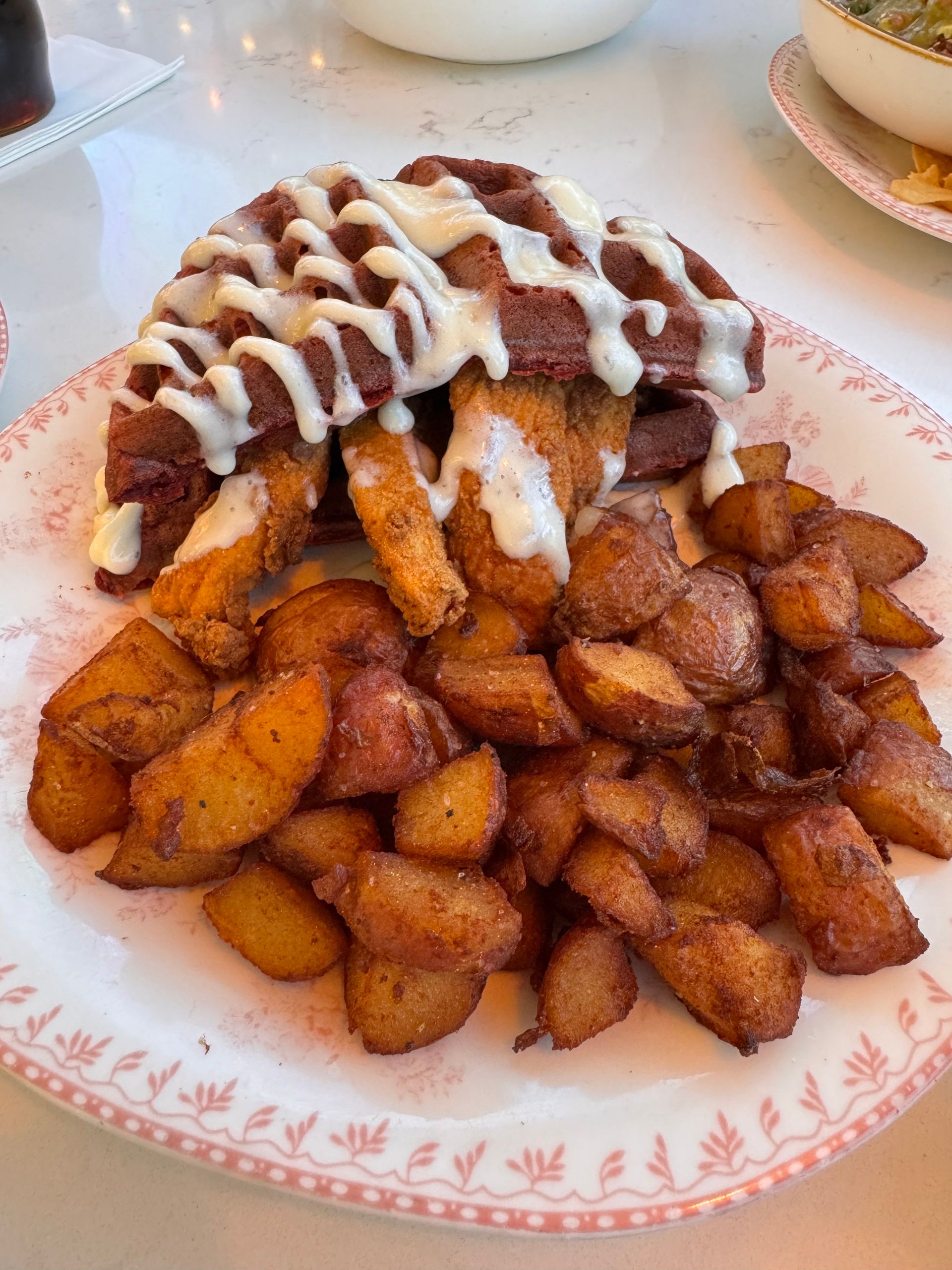 Last but not least I moved onto the Red Velvet waffles with chicken tenders and potatoes.