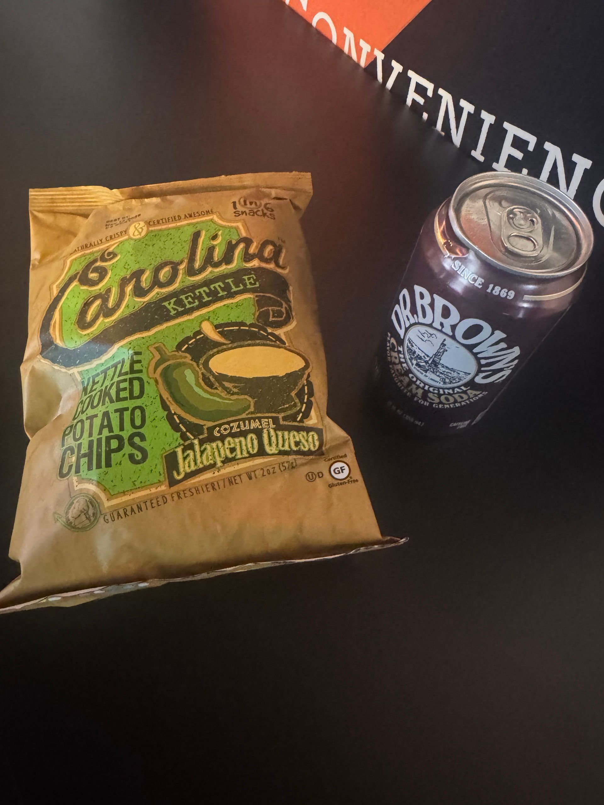 I ordered the Tony Soprano, got some Carolina Kettle jalapeño and queso chips with a Dr. Brown’s cream soda to drink.
