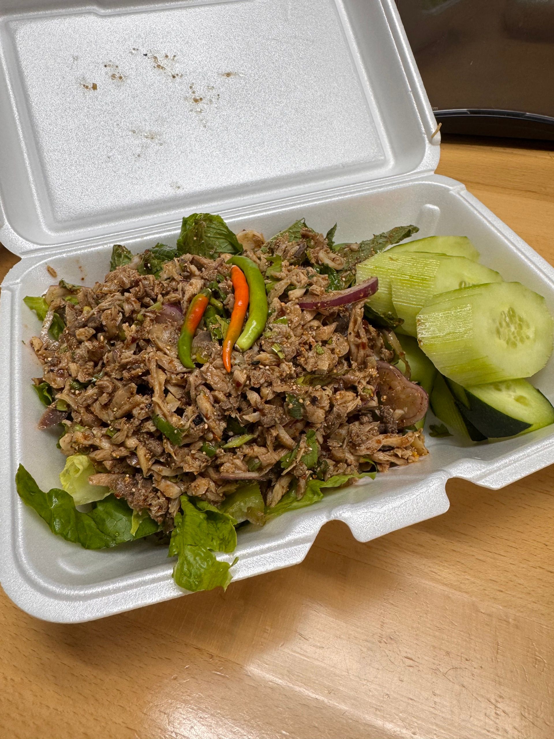 The plate came out fresh and hot with sliced cucumbers and sticky rice. Laab is essentially chopped, minced meat (this is chicken but they offer beef, duck, etc) with lime juice, fish sauce, onions and other spices, ingredients, etc. It was very spicy, fragrant and fresh.